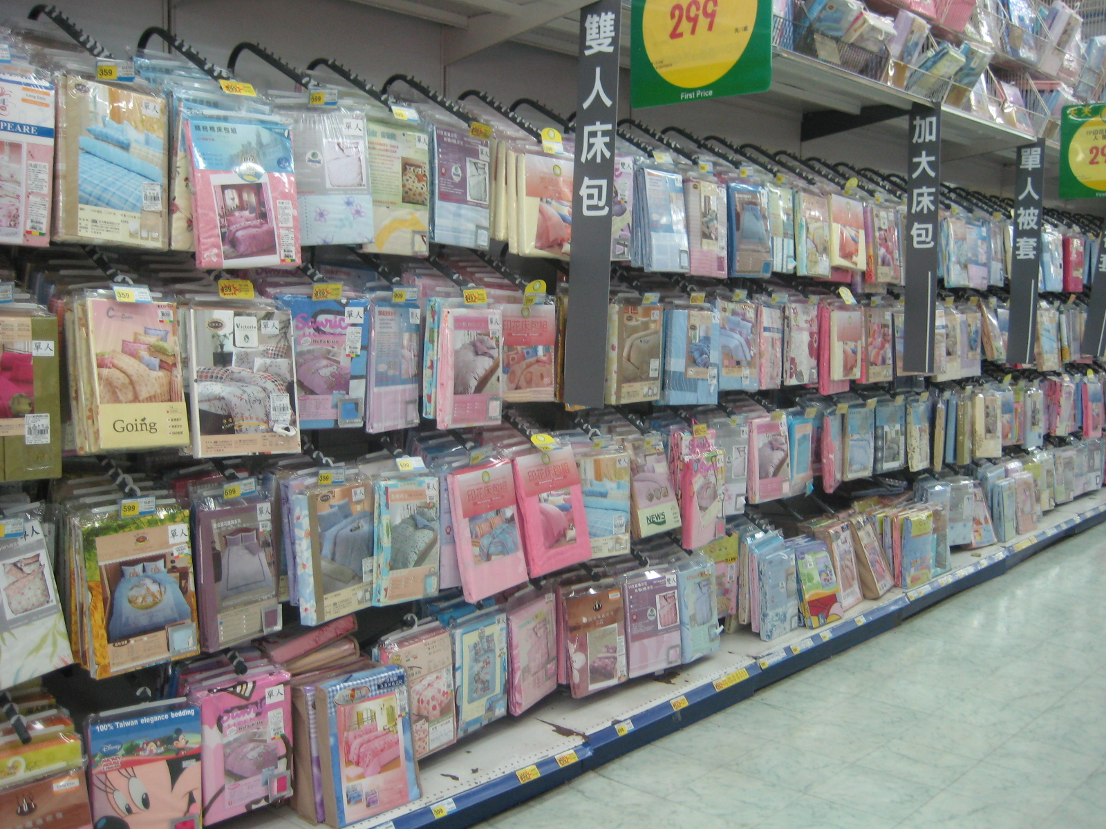 Something I won’t find no matter where I look on the island is a flat sheet. Fitted sheets? Yes. Pillow cases? Found ’em. Ugly-as-sin comforters and blankets? All over the place. One lonely, 100% cotton, comfortable flat sheet? I may as well ask for a talking fish. It’s apparently a ridiculous request, which I only found out after spending an hour (spread out over two trips) in the sheet/pillowcases aisle at RT Mart. I even tried comparing Pinyin characters (the traditional Chinese writing) on different packages to see if I could figureout what character meant “fitted sheet”, which one meant “pillow case”, and which one was the glorious “flat sheet”.