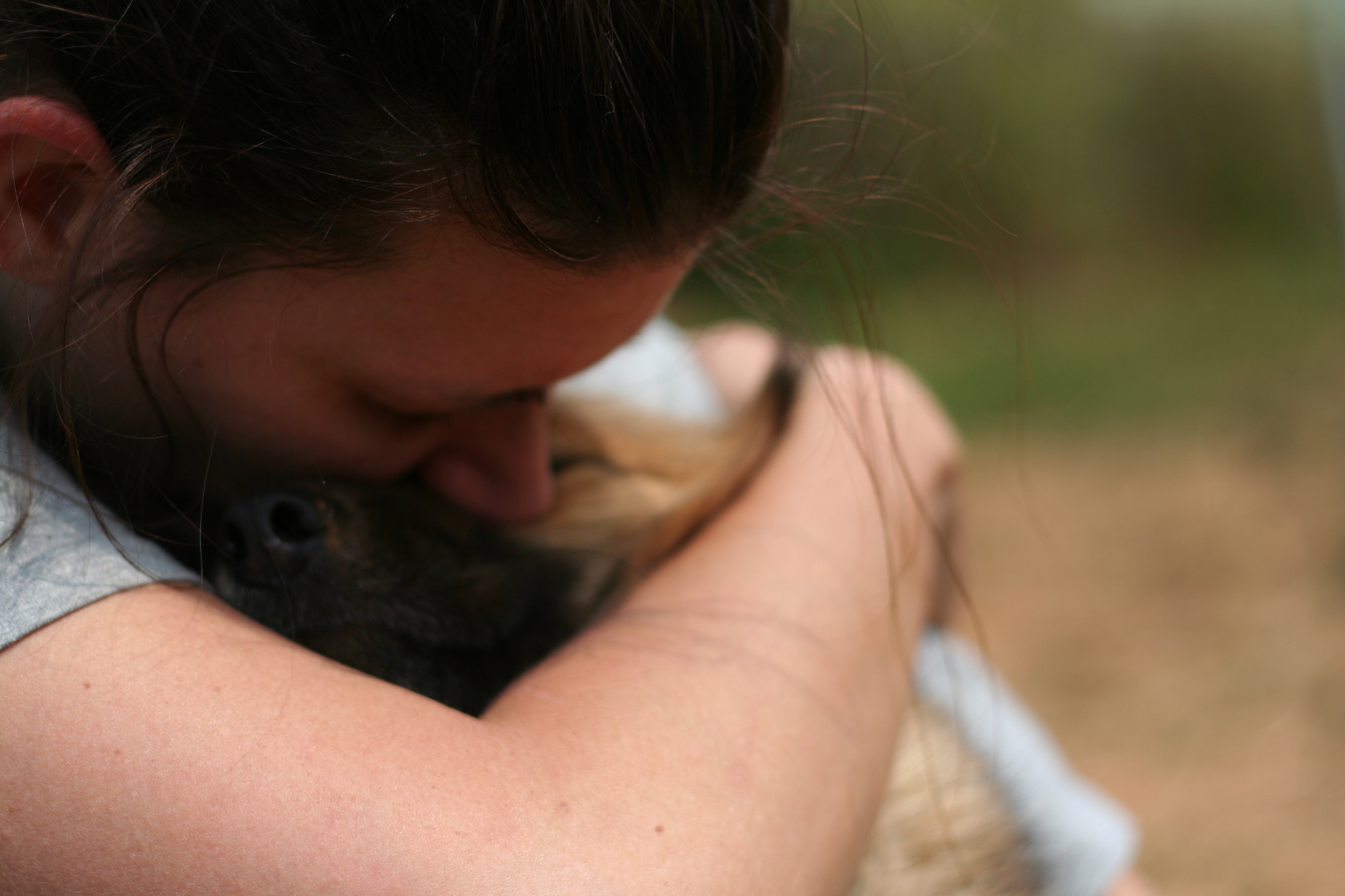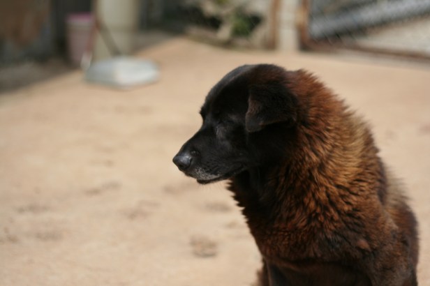 My chance comes when the dogs have trotted back into their cages, which they do so willingly after a few hours outside. I sit, alone, by the gate. She walks out from the small grove of trees, sees me watching her, and slowly comes to me. There’s nothing cautious about her approach. This dog strikes me as an old soul, and she knows I desperately want to interact with her again before leaving. She stands between my knees and allows me to rub her ears. The entire time, she stares into my eyes. I feel that she’s looking at my soul, and I become so overwhelmed that I tear up. She is a calm animal, quiet, powerfully soulful, and after I murmur a few words to her, she turns and walks away.