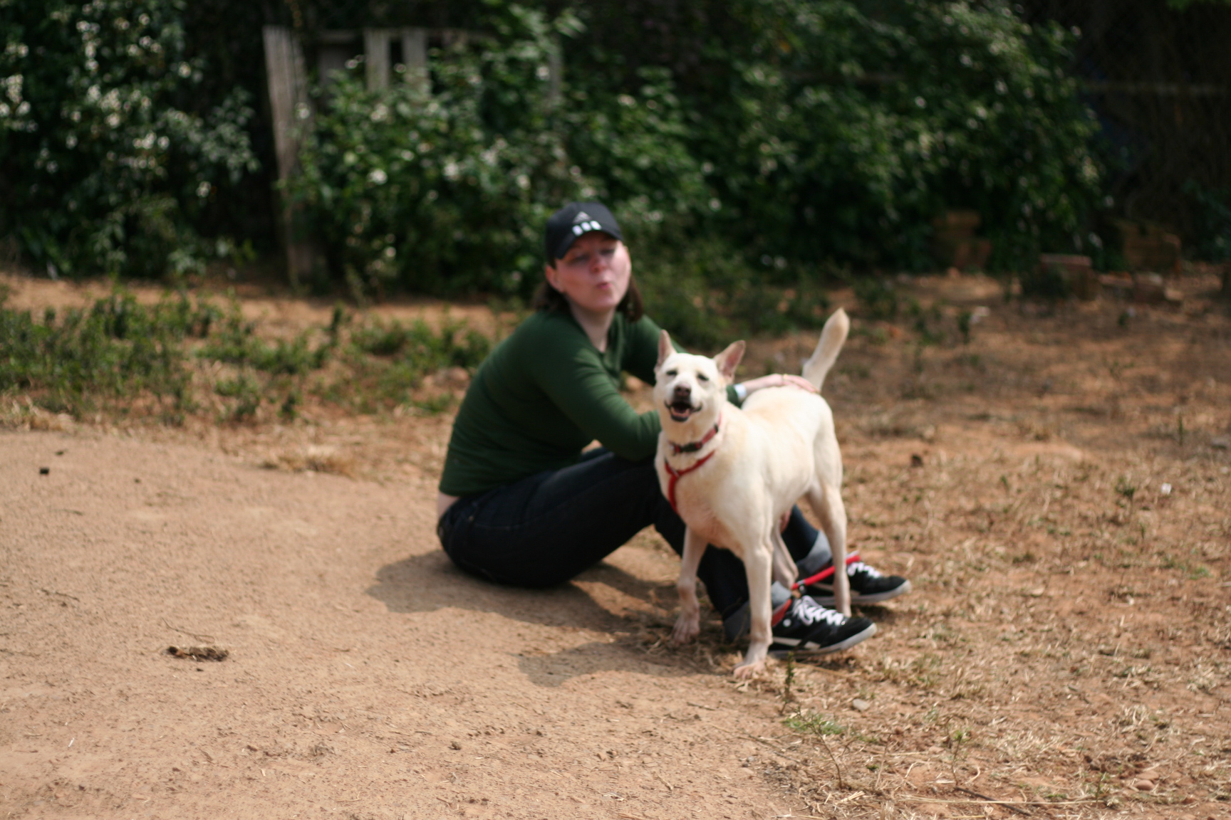 Pickles, a dog that no longer has a bottom jaw, comes up to me as I sit on the ground; when I begin rubbing behind her ears, she melts into my lap and soaks up the love. A medium-sized white dog approaches me, and I massage his head and give him butt rubs; Nicola takes pictures of our interaction.
