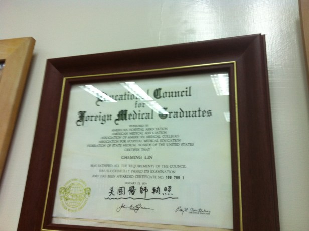 Within the hour we were in her Rav 4 making our way through the rain and cold to the doctor. We signed in, paid 200nt ($6.62) each after giving our national insurance cards, then waited. First in line was great, as many people came in after us and it was first come, first served, but the doctor was half an hour late. I was willing to wait, though, when I saw a plaque on the wall from the Educational Council for Foreign Medical Graduates.