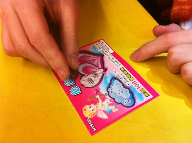 Post purchase, Amy led me to the City God Temple, outside of which was a lottery ticket stand. We bought two Valentine’s-themed tickets.