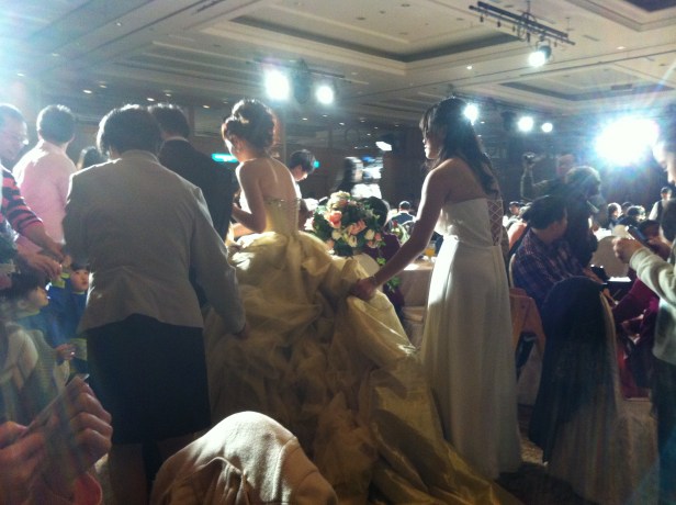 There’s no bouquet toss, no dancing, no cake-cutting, and no grand exit. You will, however, either be treated to karaoke or a rich 1990’s playlist of love songs: Boys II Men, Celine Dion, Phil Collins (“In the Air Tonight”), and the random English-language love song that’s a total bummer. Michael Bolton’s “How am I Supposed to Live Without You” is popular.