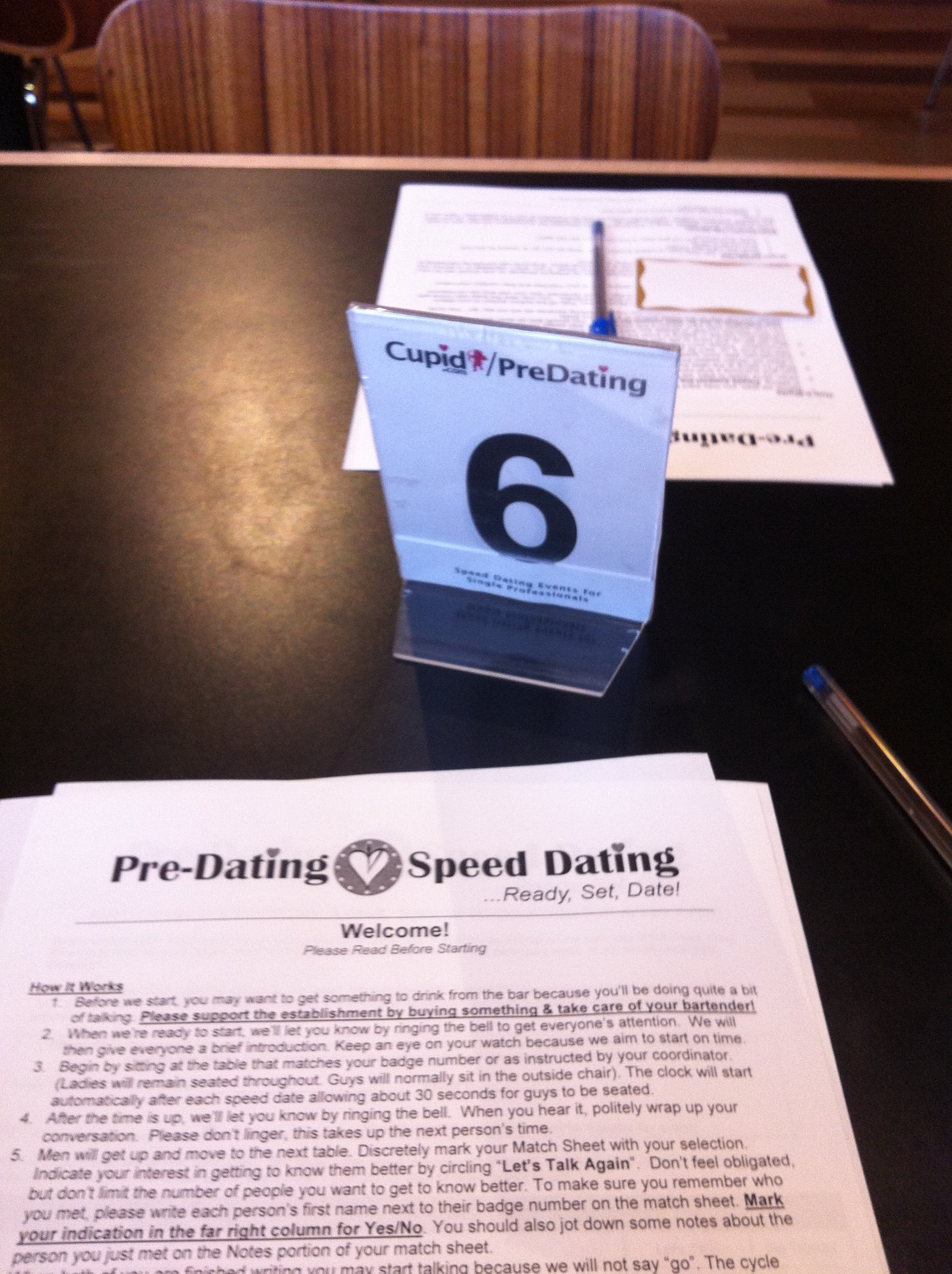 There were three pages in front of me: one detailing the rules, one where I could write notes about each “date”, and one I had to turn in at the end if I wanted to connect with one of the guys. Sitting at a table, an empty chair across from me and a placard with a 6 in the middle of the table, I read the rules.
