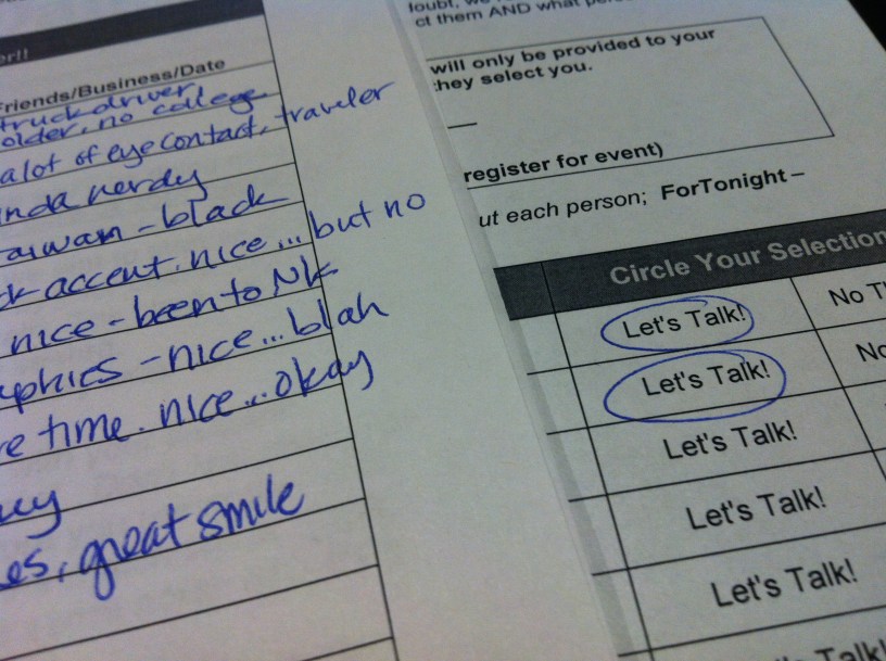 I noticed that the guys, without any concern for privacy, would fill out their “Let’s Talk!/No Thanks.” sheet in front of me; I could read everything. Meanwhile, I had my notes page covered, and I hid what I wrote as though they were missile launch codes.