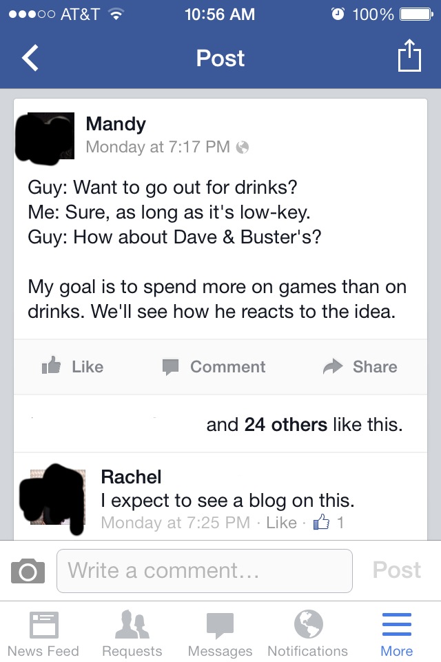 My date and I emailed back and forth a bit through Match Mail, and he asked me out for drinks. I replied that I was up for something low-key, and he suggested we go to Dave & Buster’s at 8pm on Monday.