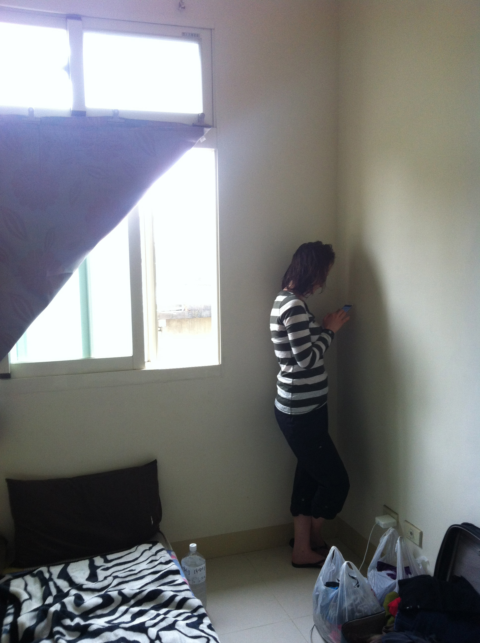 And here's Sabrina in the corner of our room in Hsinchu. This was the only spot in the room where she could get the wifi to work on her phone.