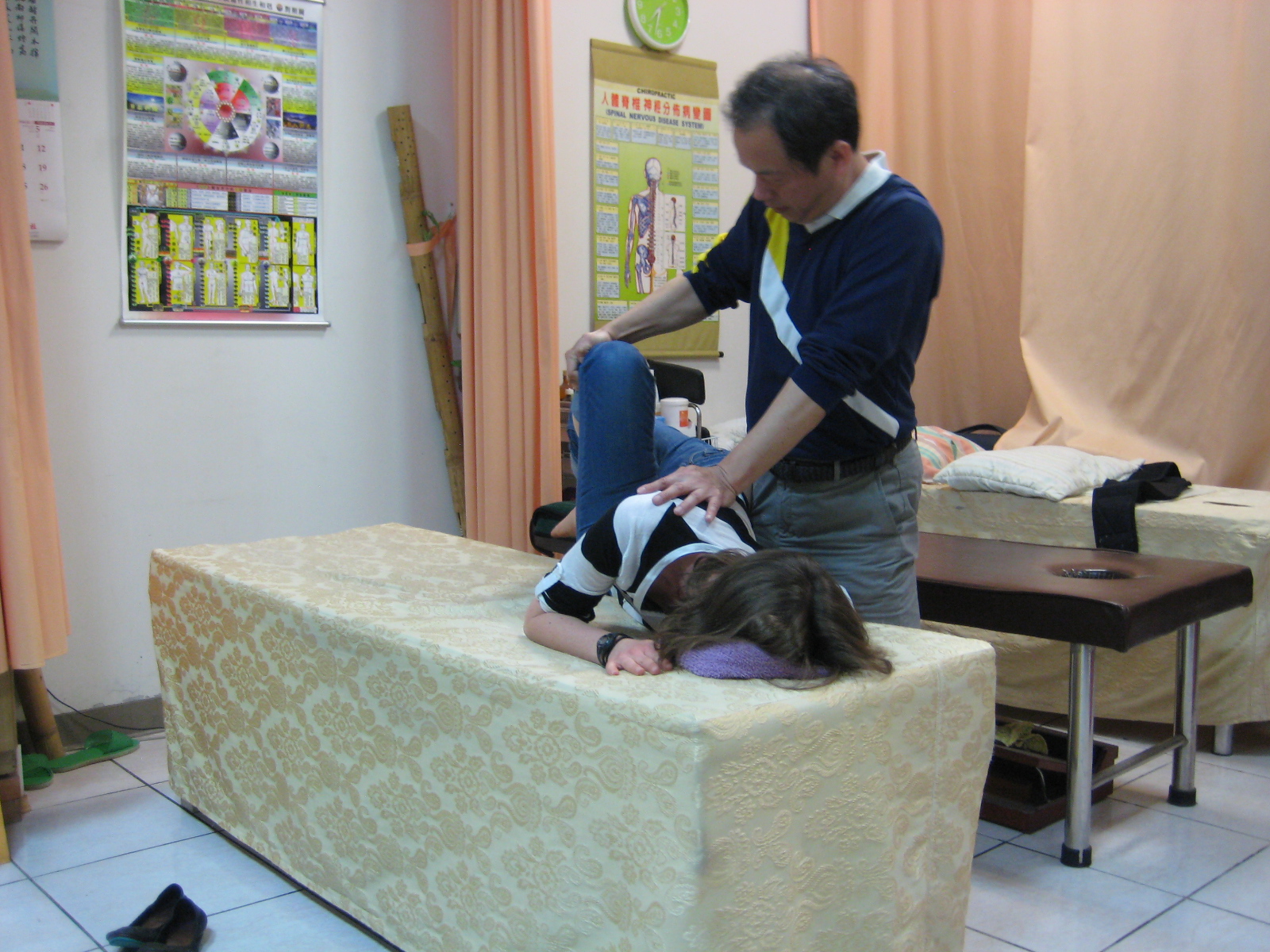 After the shelter, we all ate lunch, rested, and then Sabrina and I got adjusted at the chiropractor. This pose is a little confusing.