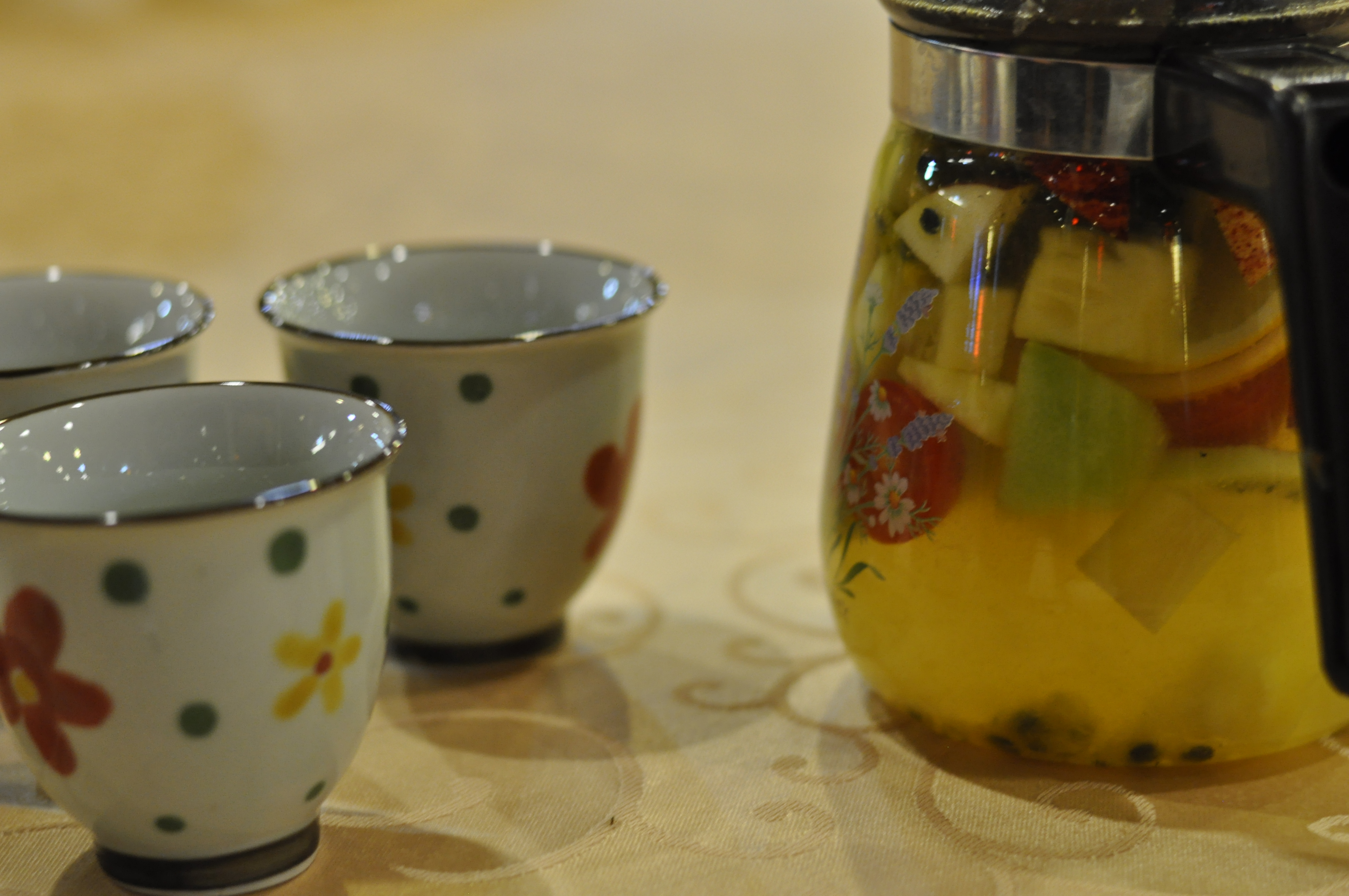 We went to a seafood restaurant and ordered fruit tea, which was delicious. In the teapot: pineapple, apple, sweet tomato, and guava, among other fruits.