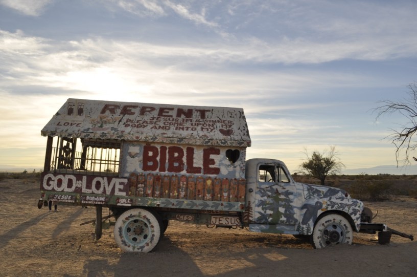 Salvation Mountain isn’t imposing. When I first got there, I didn’t think much of it. Then I started to explore, and soon I felt good about coming. And not because I’m a Christian in a place that has “GOD IS LOVE” painted as high as I am tall – because, honestly, much of Knight’s Christian message is fire and brimstone. Which isn’t really my thing.