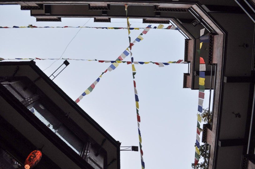 Lunch was on the roof of the restaurant next door to the centre, and several of us enjoyed our first taste of mo mo, the Nepalese version of dumplings. This was our first chance to sit as a group and get to know each other a little better, and Sylvie and I had everyone convinced we’d been friends before the trip because our humor was so similar. During lunch we were entertained by a Buddhist prayer, punctuated by sighs and the speaker clearing his throat, recited over loudspeakers at the stupa.