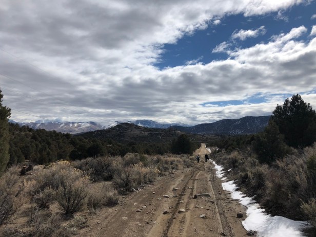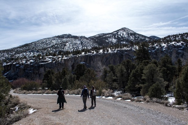 An hour and a few turns later, we’re climbing into the wild of Great Basin National Park. There are finally trees, and it’s a scene of green trees, white snow, blue skies, and dusty brown roads. The main trails we had planned to hit are cut off by thick patches of snow, so we improvise.