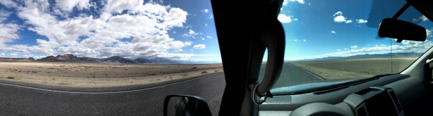 Past the bloated cow, we reach the part of highway 375 just east of Area 51. Twelve miles is the closest you get to this “secret base” unless you take an unmarked dirt road west. The area suddenly looks bucolic. Green. Gentle, rolling hills. These treeless mounds are out of character for the area. As soon as we’re past Area 51, they’re abruptly gone. The more familiar brown, flat landscape takes back the scenery.